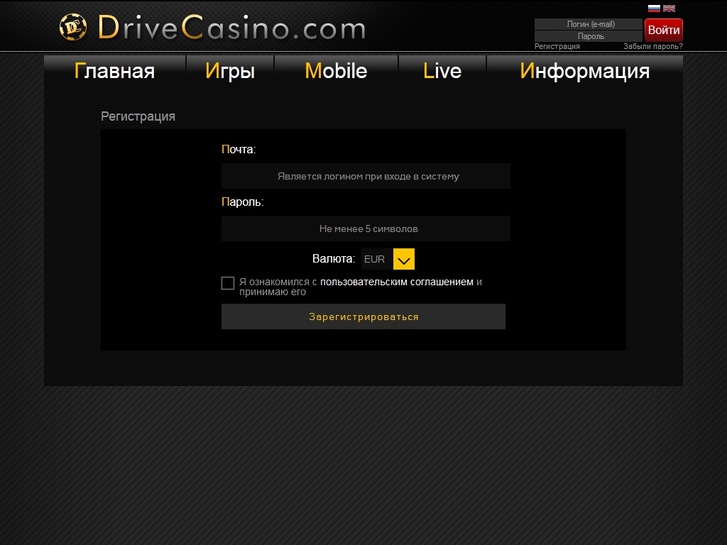 Играть в Drive можно в российских рублях и евро. Для внесения депозитов и снятия денег предусмотрены различные методы, из числа которых каждый сможет выбрать наиболее удобные. Поддерживаются основные банковские карты и наиболее популярные платежные системы.