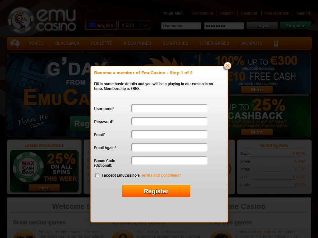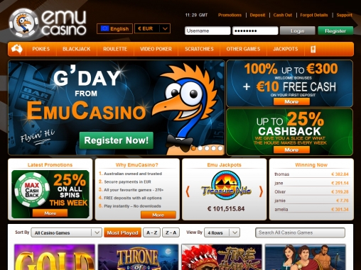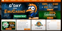 EmuCasino названо в честь забавной птицы, обитающей на австралийском континенте. Неудивительно, что на его логотипе изображена именно она. Сайт казино обладает эффектным дизайном, в котором крупные и яркие баннеры замечательно смотрятся на приглушенном фоне в виде австралийского флага. Здесь очень много полезной информации, с которой приятно и удобно знакомиться, так как структура ресурса тщательно продумана ради комфорта клиентов.