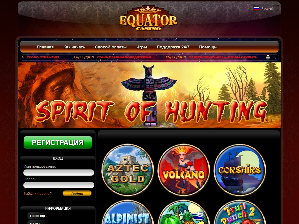 Интерфейс Equator Casino доступен на английском, русском, испанском, немецком, итальянском и французском языках. Основной является англоязычная версия. На русский вся информация на сайте казино переведена очень качественно.