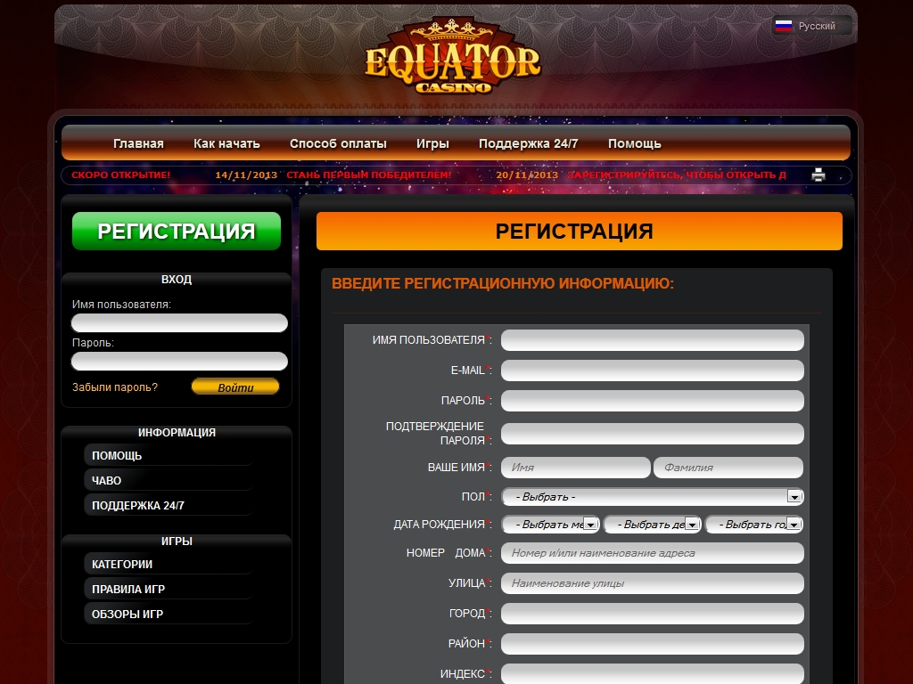 При регистрации в Equator Casino нужно будет заполнить подробную анкету. Поля подписаны на русском, но данные стоит вводить латинскими буквами.