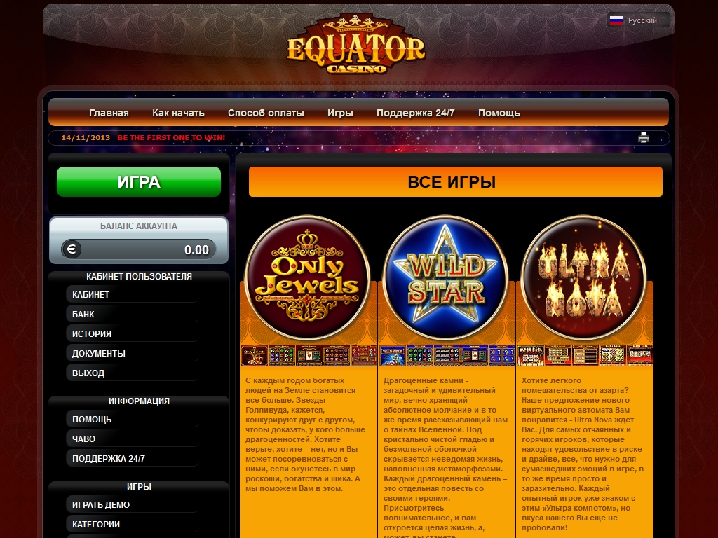 Equator Casino можно смело отнести к числу заведений, которые делают лишь первые шаги в сфере интернет-гемблинга. Вы сами в этом убедитесь, когда прочтете обзор казино и лично с ним познакомитесь.