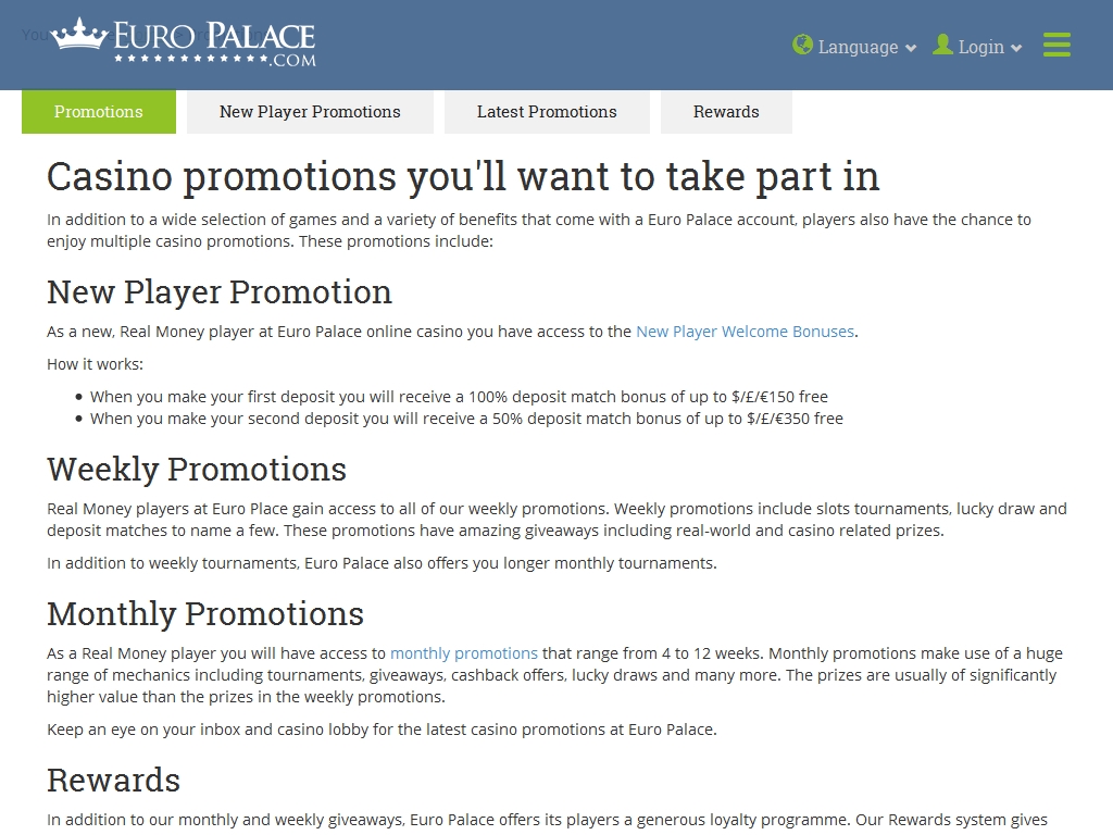 Рассматриваемое в обзоре заведение работает на протяжении нескольких лет, потому совсем юным его назвать нельзя. EuroPalace предлагает качественный софт, интересные промо-акции, щедрые бонусы и многое другое, что обычно привлекает разнообразную публику, неравнодушную к азартным развлечениям.