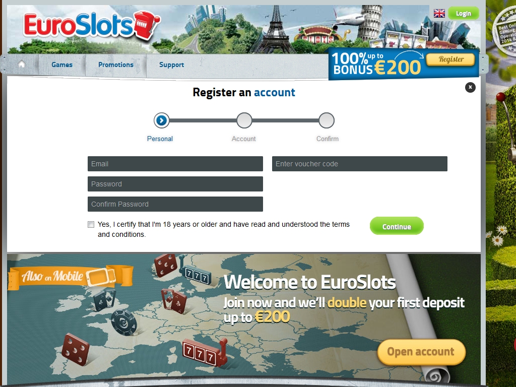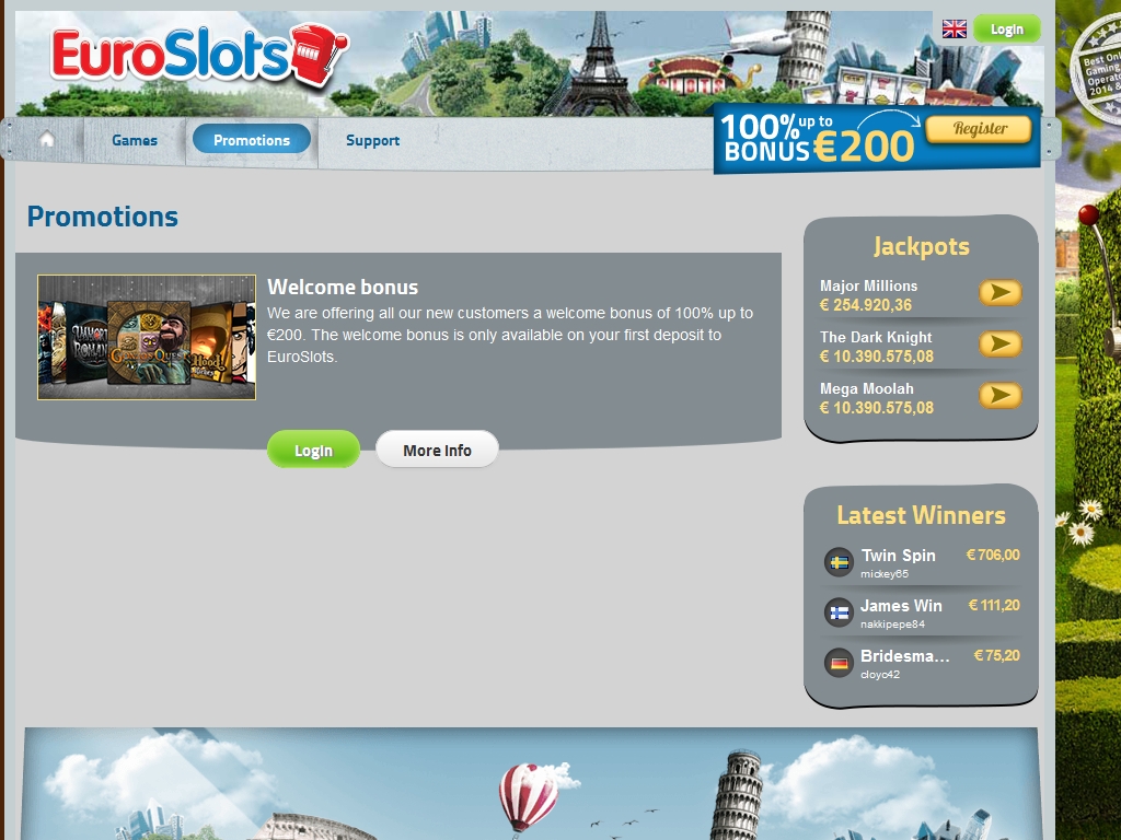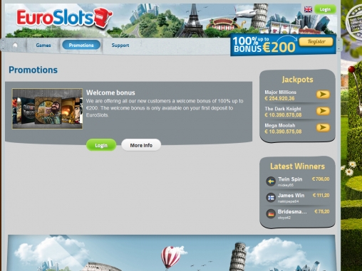 Новые клиенты Euro Slots могут воспользоваться пригласительным 100% бонусом размером до 200 евро. Он начисляется на первый депозит, который они вносят на счет после регистрации в заведении. Минимальная сумма пополнения, необходим для получения бонуса, равна двадцати евро. Отыгрывать его нужно в сорок раз (только сумму бонуса). Подробности уточняйте в правилах на сайте Euro Slots Casino.