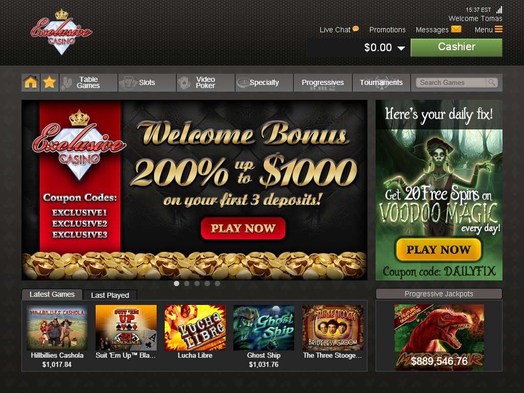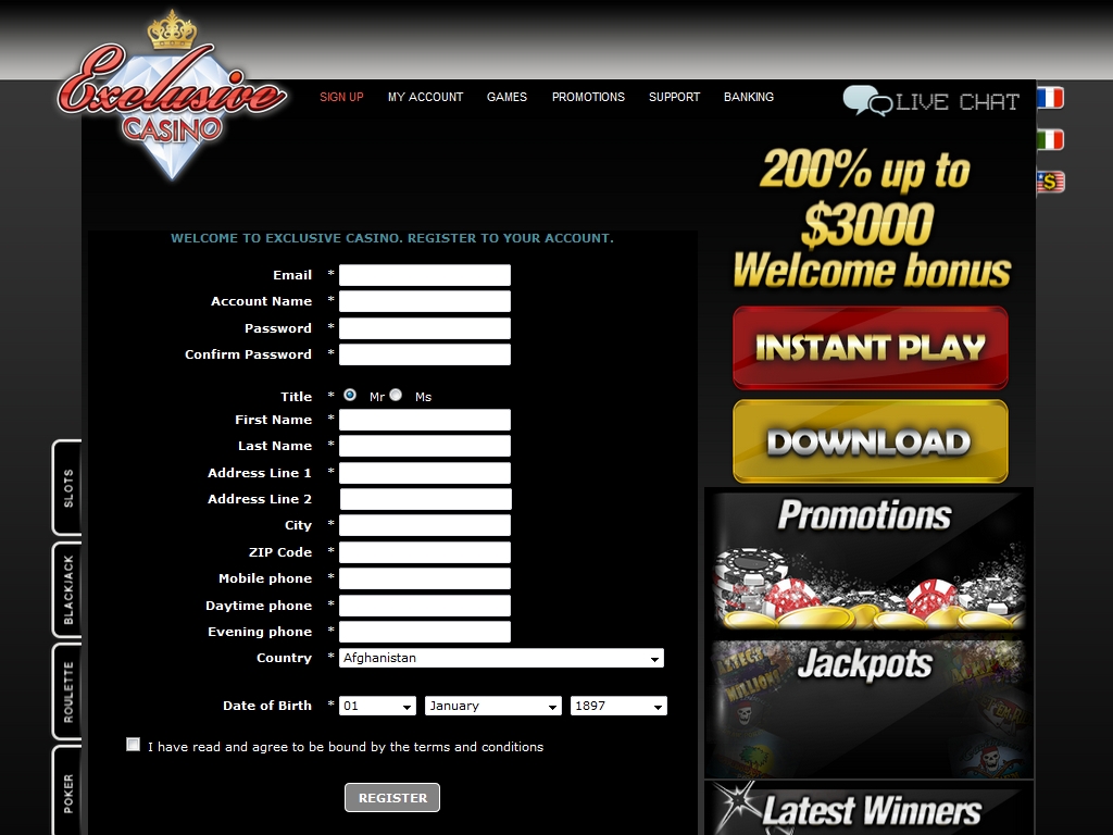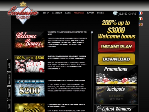 Играть в Exclusive можно в долларах США. Для внесения депозитов и вывода средств со счета предусмотрены такие методы, как Visa, MasterCard, Neteller, Moneybookers, Instadebit и некоторые другие.
