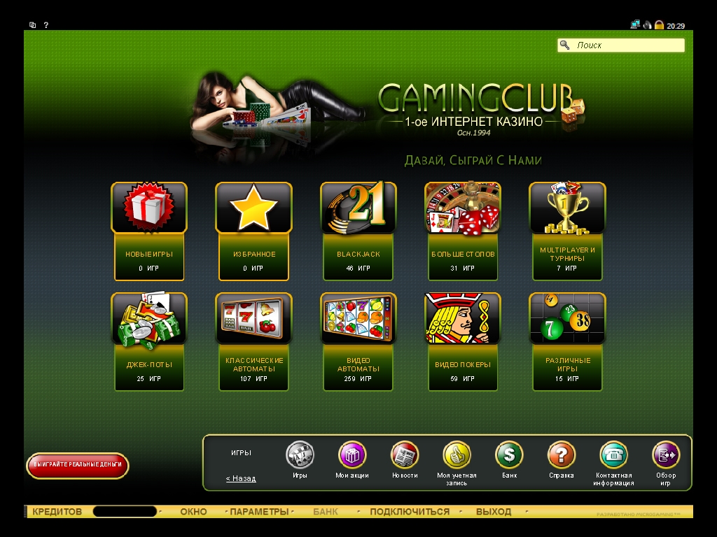 Играть в Gaming Club Casino можно во флеш-версии прямо в браузере либо при помощи специальной программы, которая доступна для бесплатного скачивания на сайте казино. Второй вариант предпочтительнее, потому что он открывает доступ ко всем возможностям. Например, во флеш-версии предлагается приблизительно на двести игр меньше, и по качеству графики они значительно уступают тем, что предлагаются в программе.