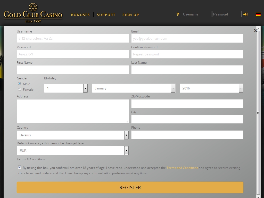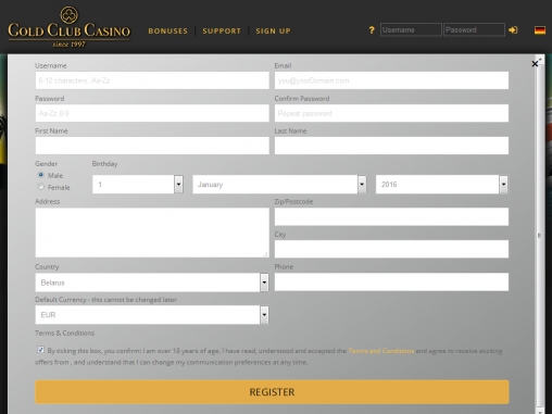 Для регистрации аккаунта в Gold Club нужно заполнить анкету достоверными данными и следовать дальнейшим инструкциями. Весь процесс от начала до конца занимает пару-тройку минут.