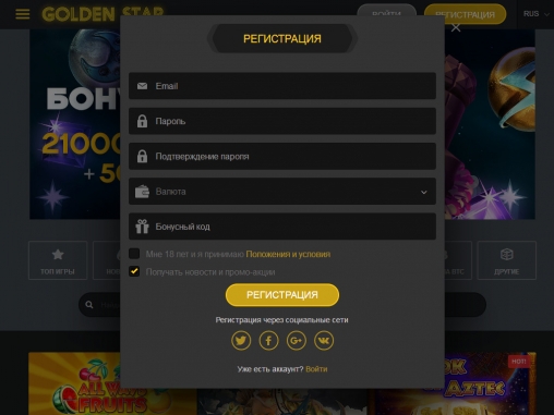 Новички могут зарегистрироваться в заведении со смартфона. Пользователи с действительными аккаунтами должны использовать существующие счета. Заводить отдельные профили для игры в мобильном казино Golden Star не нужно.