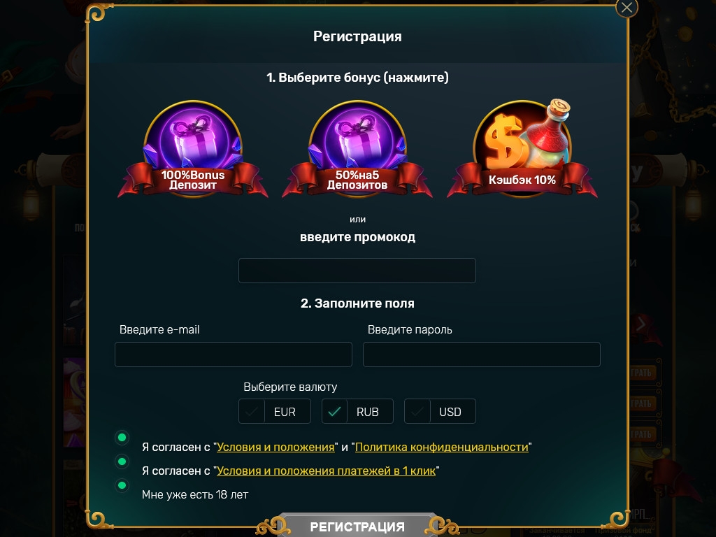 Регистрационная анкета очень простая. Нужно выбрать бонус, указать имя пользователя и пароль, отметить предпочтительную валюту и поставить галочки в окошках, подтверждающих согласие с правилами.