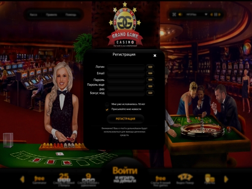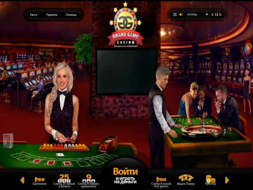 Grand Game Casino – это типичное казино на платформе Casino4You. Если вы видели хотя одно из подобных заведений, это вас ничем не удивит. Главная страница стилизована под большой зал казино. Изображенные на ней персонажи топорно анимированы, так что их судорожные движения сразу же вызывают улыбку. Все элементы меню более чем знакомы.