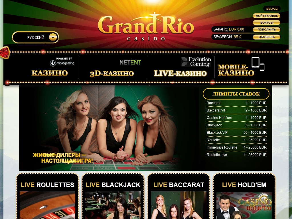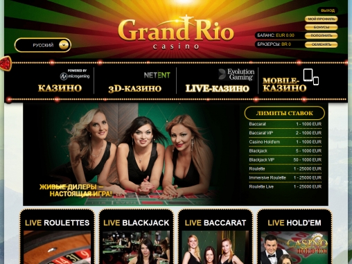 Программное обеспечение для реализации игрового процесса с настоящими крупье предоставила компания Evolution Gaming. Трансляция игр ведется из ее собственной студии. Можно делать ставки за столами для баккара, блэкджека, техасского холдема и рулетки. Подробнее этот раздел Grand Rio будет рассматриваться в отдельном обзоре.