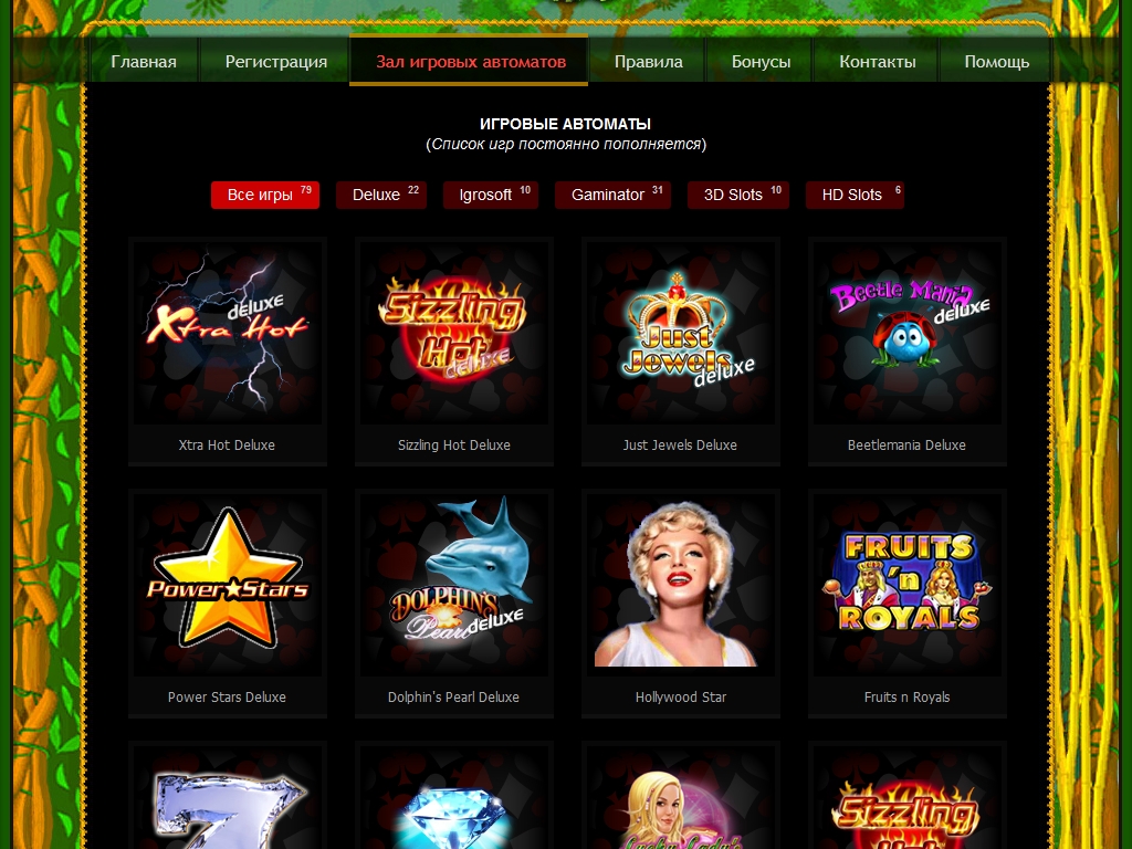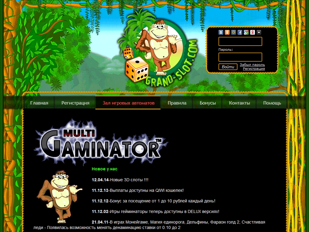 Черный фон, зеленые джунгли, веселая обезьянка на логотипе и список доступных игровых автоматов – так выглядит сайт Grand Slot. Больше об оформлении ресурса сказать нечего.