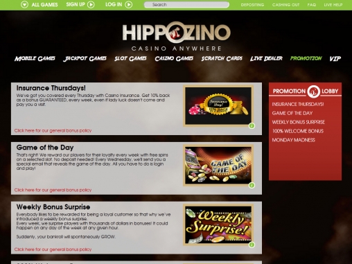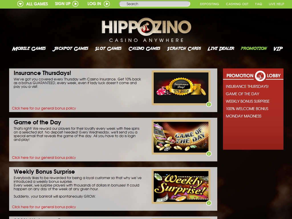 «Гиппозино» предлагает клиентам неплохой выбор разнообразных бонусных акций. Вкратце рассмотрим их: