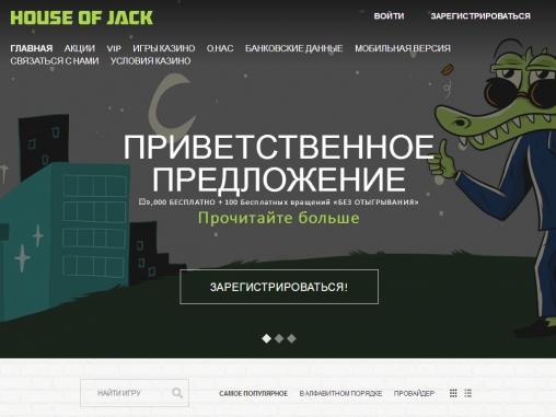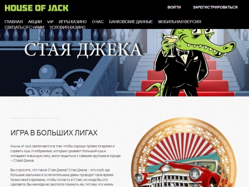 Приятная цветовая гамма, большие баннеры с рекламой бонусов и других акций, логичная структура меню с многочисленными разделами, простой логотип – таков дизайн интернет-казино House of Jack.