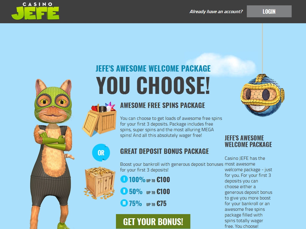 Интернет-казино JEFE приглашает любителей азартных игр получить бесплатные вращения за регистрацию и стать обладателями щедрых бонусов и дополнительных фри-спинов на первые депозиты. Далее они смогут принять участие в акциях для постоянных клиентов, испытать удачу на слотах лучших производителей, побороться за огромные джекпоты и воспользоваться другими услугами.