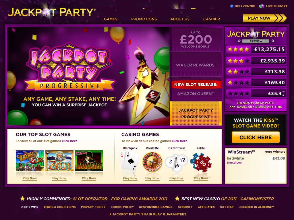 Jackpot Party Casino – это молодое онлайн-казино, работающее с 2011 года. Оно было основано знаменитой компанией WMS, крупным производителем слотов, история которого началась еще в 1943 году. Лицензию заведению выдала Комиссия по контролю игорного бизнеса Олдерни, Великобритания.