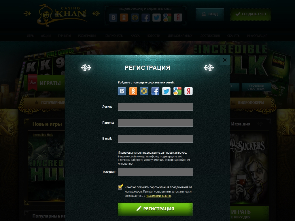 Чтобы зарегистрироваться в казино «Хан», нужно заполнить небольшую анкету, указав логин, пароль для входа, контактный адрес электронной почты и номер телефона.