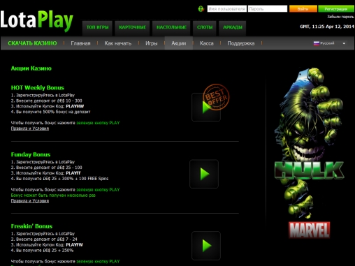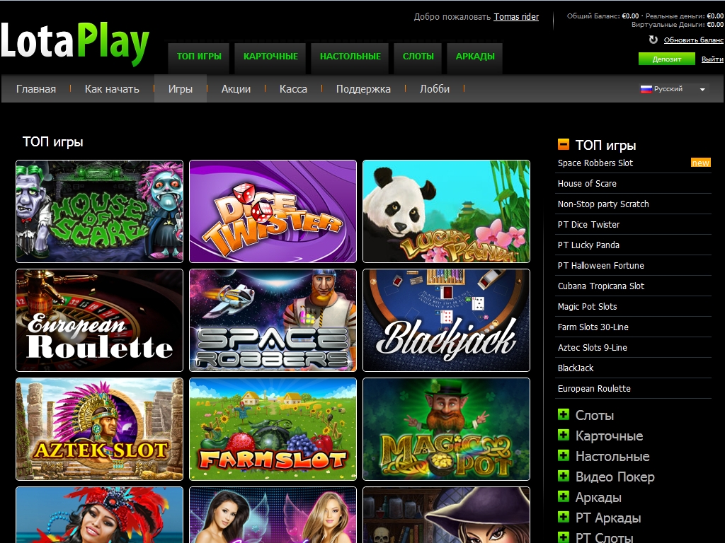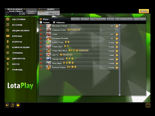 В «ЛотаПлей» предлагаются разнообразные игровые автоматы, видео-слоты (включая 3D-слоты), видео-покеры, настольные, карточные и развлекательные игры, скрэтч-карты и модели других жанров. Мы не будем подробно их описывать, потому что почти все игры от Playtech и GamesOS рассматриваются в отдельных обзорах на нашем портале.