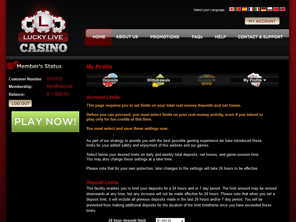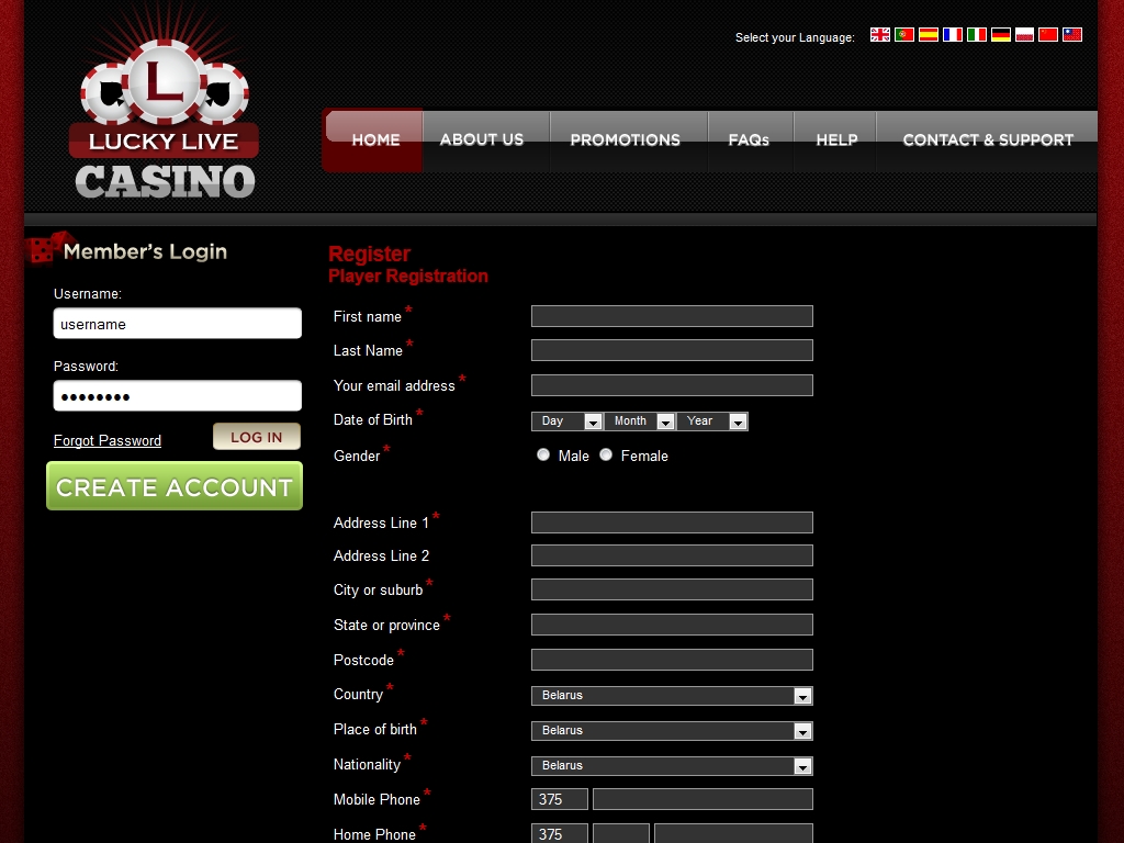 Жители Соединенных Штатов могут играть в Lucky Live Casino только в тренировочном режиме. Ставки реальными деньгами от них не принимаются. Сайт казино переведен на несколько распространенных языков, но русского среди них нет.