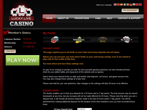 Во время регистрации в Lucky Live Casino каждый клиент казино устанавливает собственные лимиты ввода-вывода средств. Депозиты можно делать следующими методами: банковские карты Visa, MasterCard, Visa Electron, Delta, Maestro, Diners, Laser, банковский перевод, системы NETeller, Moneybookers, Clickandbuy, Eco, PaySafe, предоплаченные карты.