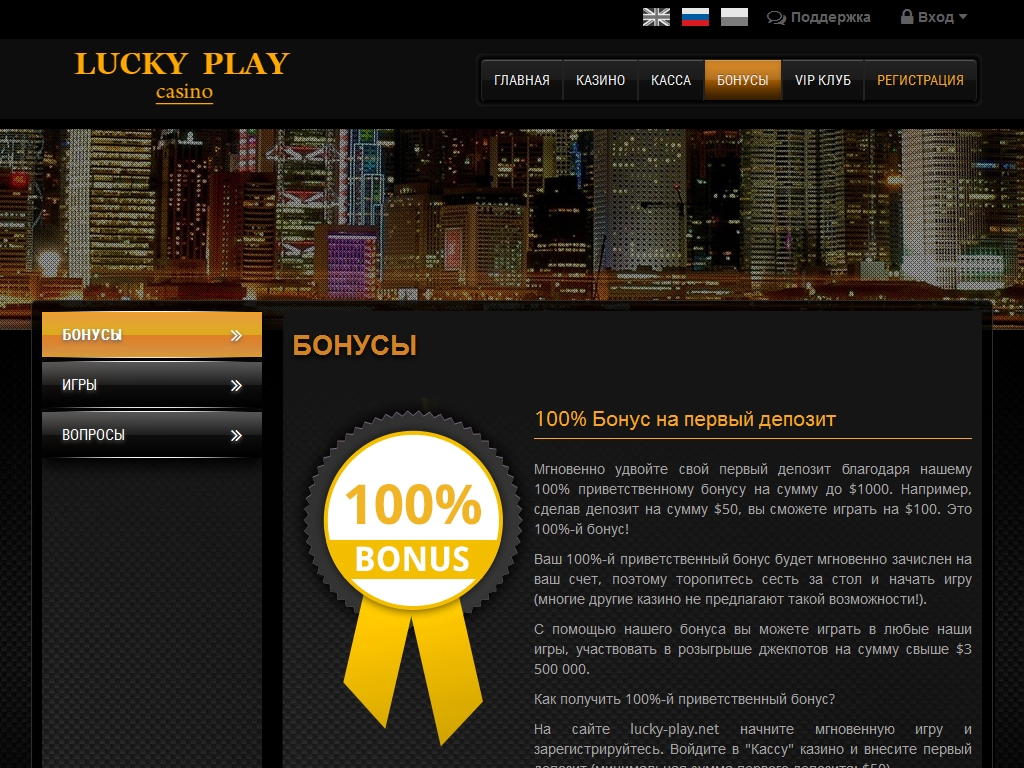 Новичкам в Lucky Play предлагается 100% бонус на первый депозит. Он может достигать одной тысячи долларов. Минимальная сумма пополнения счета, необходимая для получения бонуса, равна пятидесяти долларам. Отыгрывать его нужно в тридцать раз (внимательно изучайте правила).