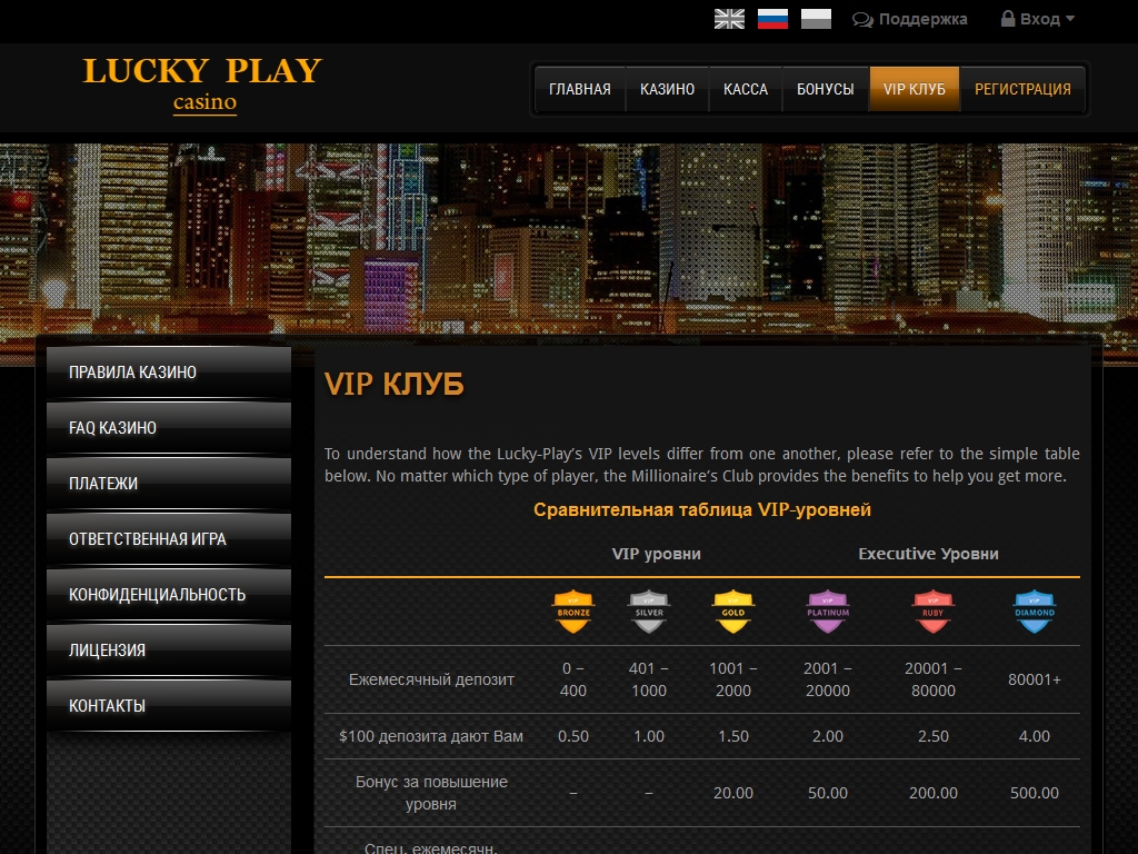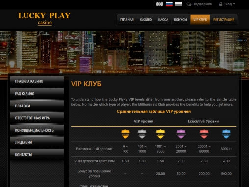 Lucky-play.net привлекает качественным софтом известного бренда, неплохим пригласительным бонусом с умеренными требованиями вейджера, наличием обширной системы поощрений для постоянных клиентов, поддержкой русского языка и разнообразных платежных систем. Также не может не радовать открытая политика руководства, предлагающего всю необходимую информацию об учредителях.