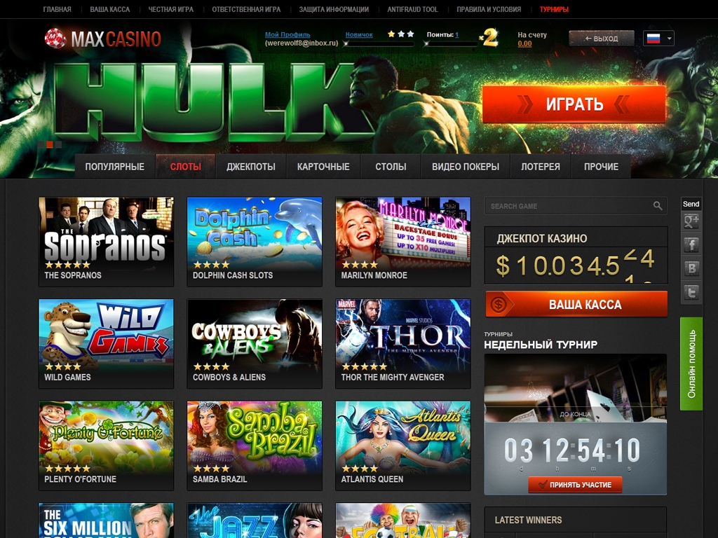Max Casino – это молодое казино, которое совсем недавно начало принимать клиентов. В целом, здесь все кажется выдержанным на достойном уровне: отличный выбор игр, турниры, джек-поты, приятный дизайн, полный перевод на русский. Правда, непонятна ситуация с бонусами, но вряд ли их здесь никогда не будет. Так что будем наблюдать за успехами Max Casino.