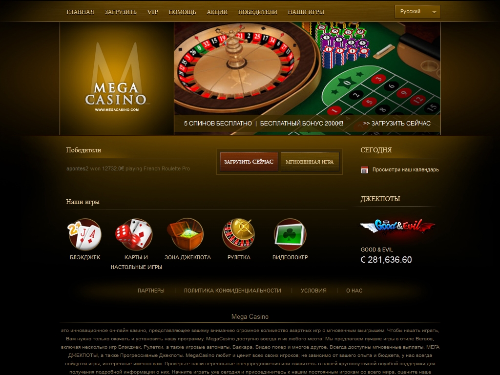 Mega Casino – это весьма неплохое онлайн казино, которое может приглянуться тем, кто устал он программного обеспечения более именитых производителей. Несмотря на небольшой выбор представленных игр, наиболее популярные из них здесь все же есть. Удобно, что можно делать депозиты и выводить выигрыши многими способами.