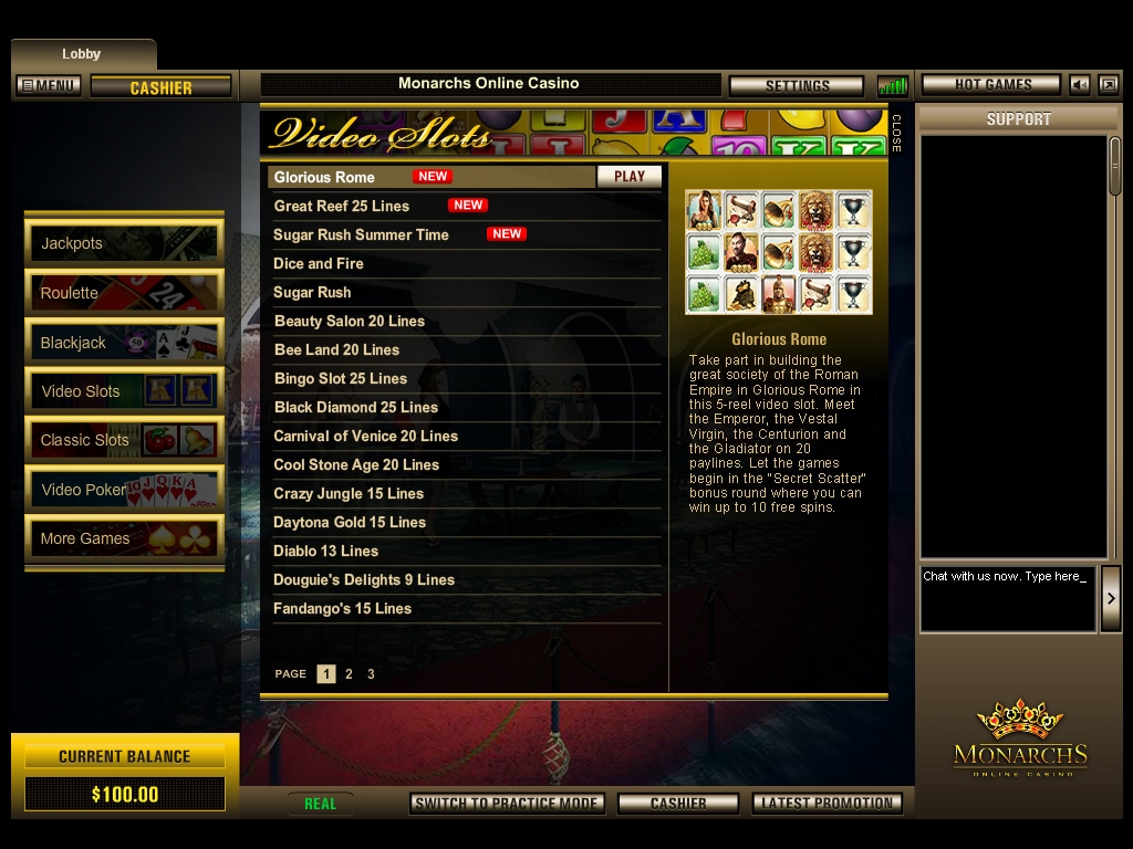 В Monarchs Casino предлагается софт производства Top Game. Ассортимент включает классические игровые автоматы, видео-слоты, разнообразные карточные и настольные игры, видео-покеры и модели других категорий.