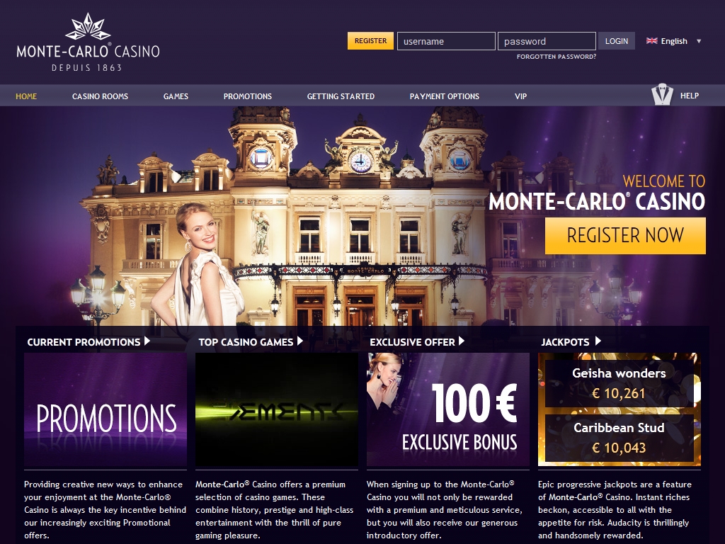 Новым клиентам Monte Carlo Casino, которые впервые открывают в казино счет для игры на реальные деньги, предлагается бонус на стартовый депозит. Он начисляется на первое пополнение счета на сумму от десяти евро. Отыгрывать его нужно в сорок раз (только сумму бонуса) по правилам, принятым в казино (уточняйте их на сайте).