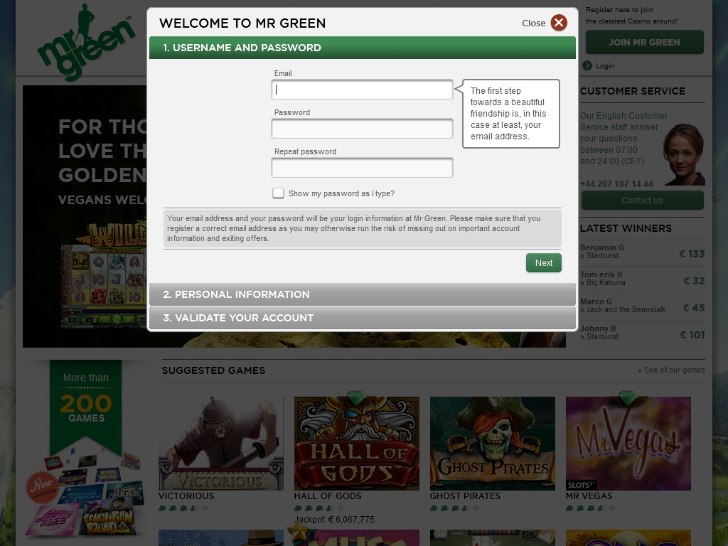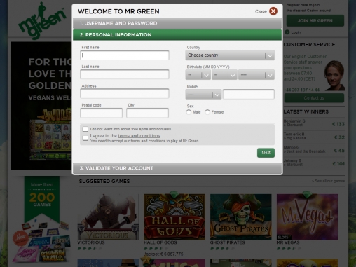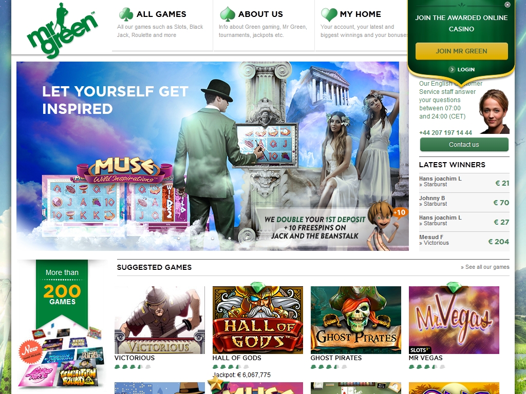 В казино Mr Green действует пригласительный 100% бонус на первый депозит до 50 евро, который нужно отыграть в 25 раз (это нельзя делать на рулетке, в блэк-джеке, видео-покере и настольных играх). К сожалению, получать бонусы могут лишь игроки из Швеции, Норвегии, Финляндии, Австрии, Великобритании и Германии.