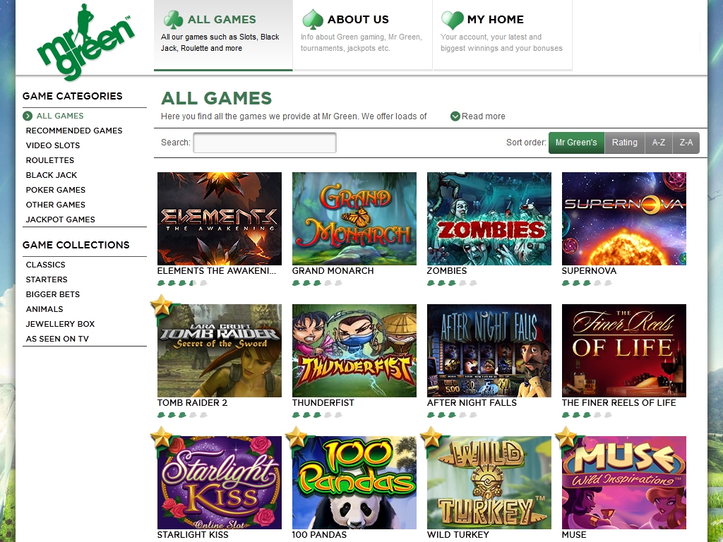 Когда первый раз заходишь на официальный сайт казино Mr Green, создается впечатление, что ты попал в компьютерную игру. Дело в том, что его оформление не имеет ничего общего с традиционным для подобного рода заведений дизайном. Сайт настолько интерактивен, что, нажимая в первый раз какую-то кнопку, не можешь даже представить, в каком виде предстанет перед тобой требуемая страница.