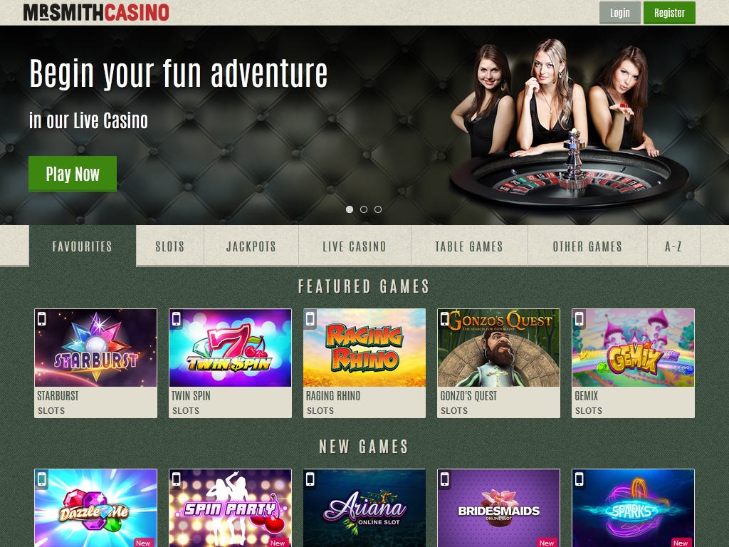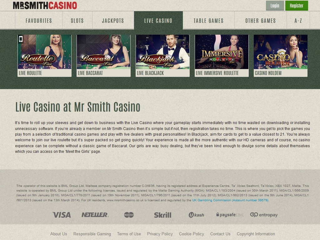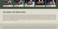 С реальными крупье в Mr Smith можно играть в блэкджек, баккара, казино холдем покер и две разновидности рулетки. Больше информации о live-casino «Мистер Смит» вы найдете в специальном обзоре.