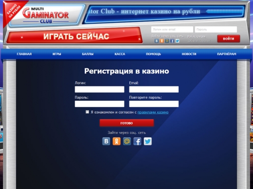 Зарегистрироваться в Multi Gaminator Club Casino можно буквально за пару минут. Также войти на сайта можно с помощью аккаунта в одной из популярных социальных сетей.