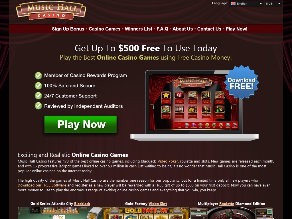 В Music Hall Casino пользователи могут насладиться 426 играми, включающими в себя традиционные и оригинальные разновидности настольных и карточных игр, слотов, видео-покеров. Многие из них дают возможность поучаствовать в борьбе за прогрессивные джек-поты, размеры которых могут достигать шестизначных цифр. Большинство игр доступно в режиме «на интерес», что позволяет бесплатно с ними познакомиться и потренироваться.