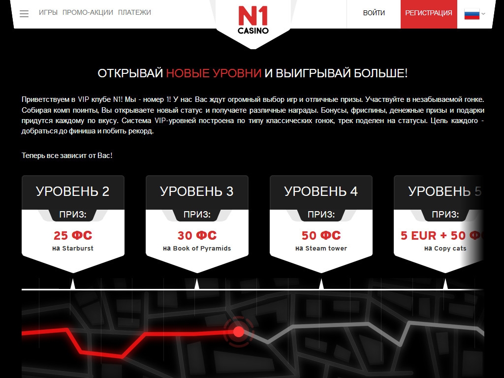 - В N1 действует система уровней. Чем выше статус клиента, тем больше преимуществ он имеет. Переходя на следующий эта, игрок открывает для себя бонусы, бесплатные вращения, призы и другие вознаграждения.