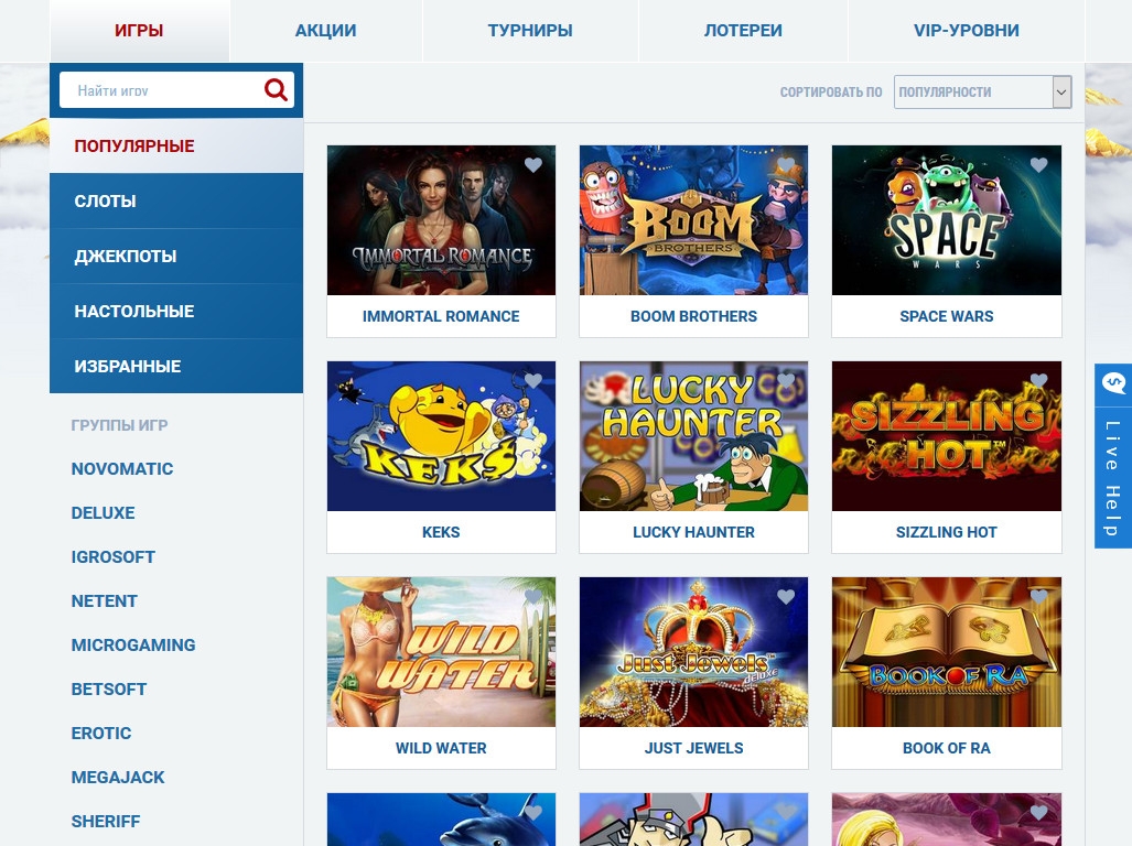 - Джекпоты – несколько слотов с прогрессивными джекпотами;