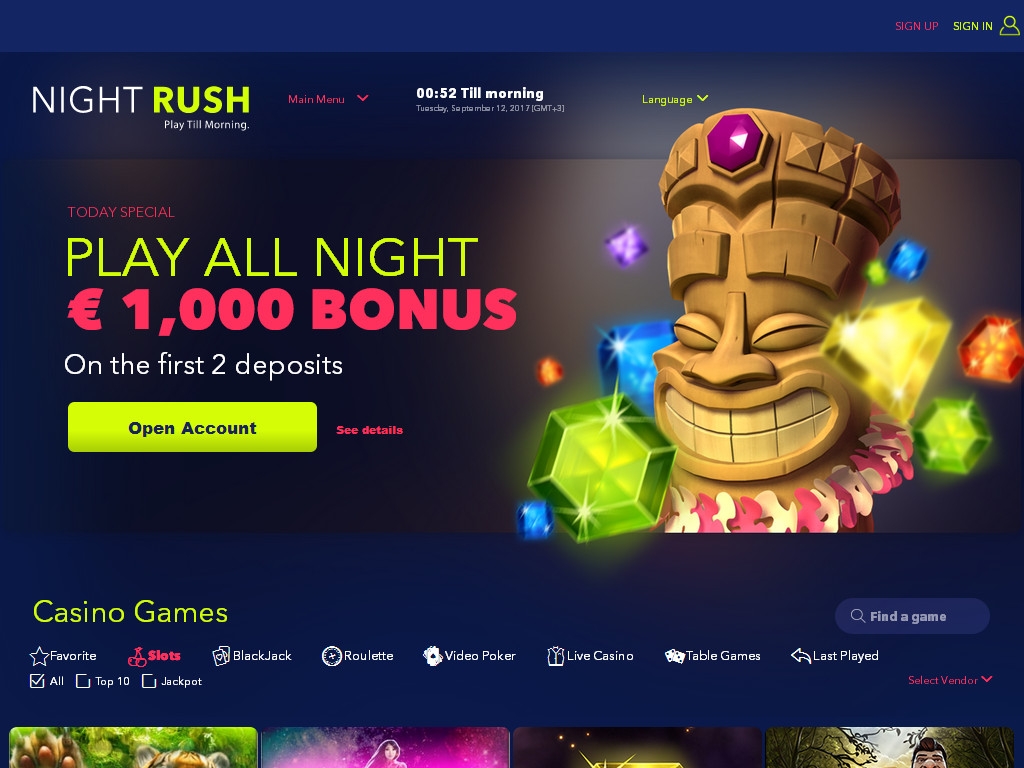Создатели интернет-казино NightRush приглашают вас играть до самого утра. Слоган, вынесенный на логотип, звучит как «Play Till Morning». В обзоре рассказывается об услугах, бонусах и развлечениях, которыми заведение надеется удерживать клиентов в своих виртуальных стенах от заката до рассвета.