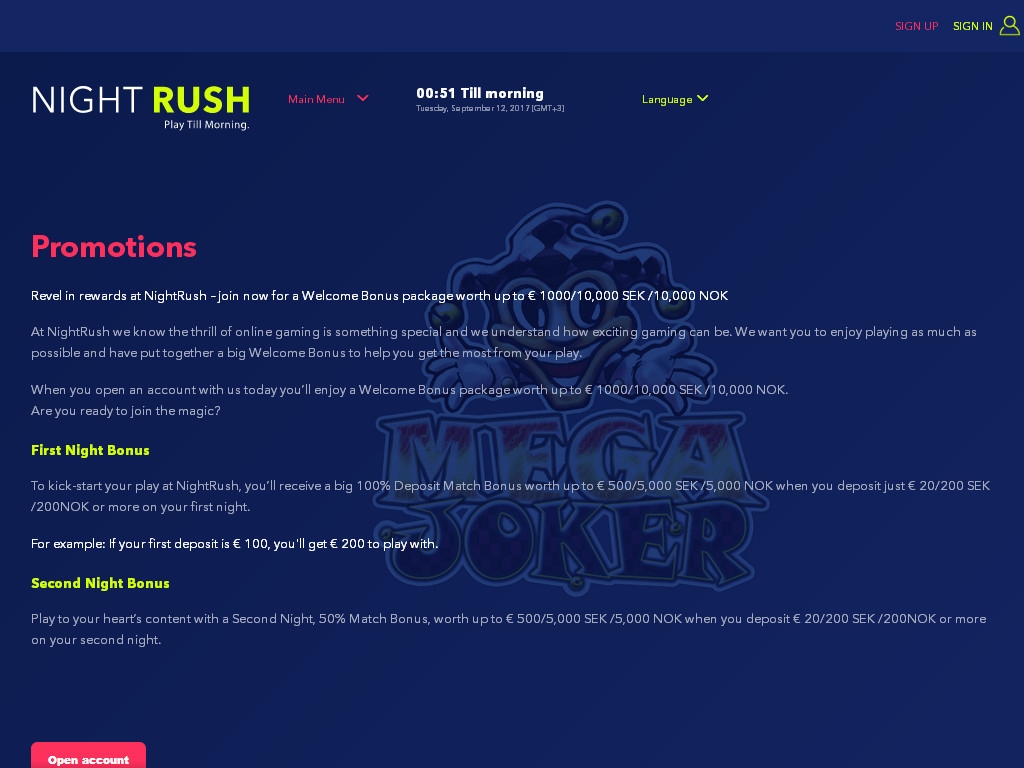Информация на сайте NightRush подается на английском (главная версия правил), немецком и нескольких скандинавских языках.