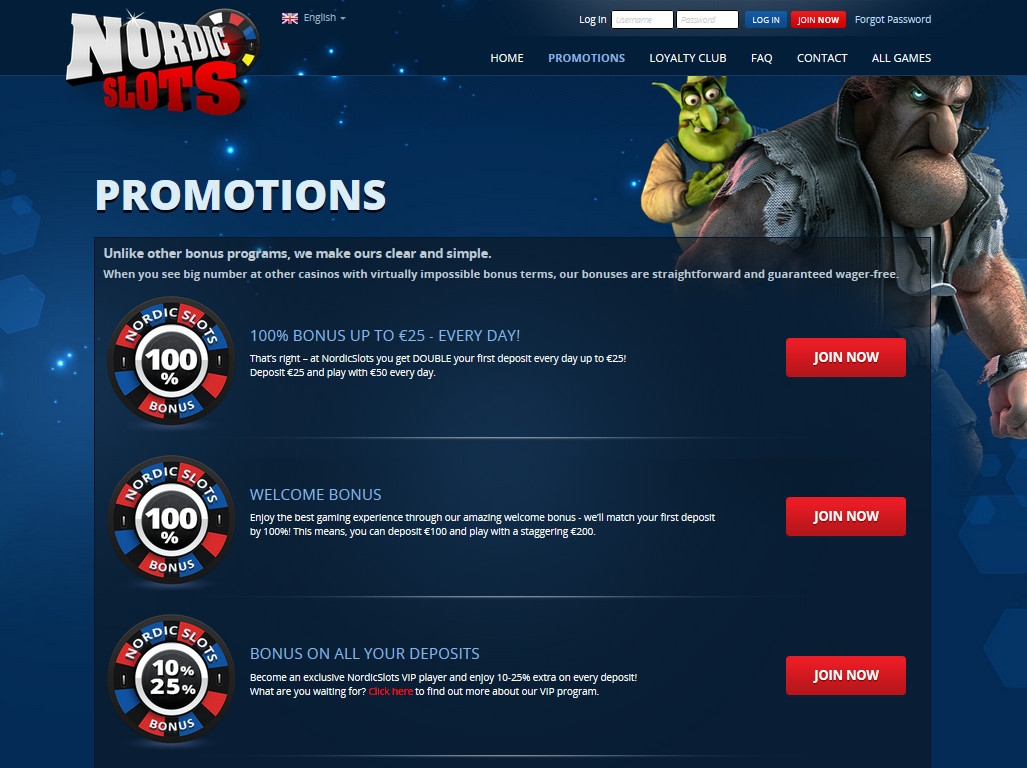 Дизайн nordicslots.com нареканий не вызывает, хотя ему явно недостает оригинальности. Сочная цветовая гамма, выразительный логотип, колоритные баннеры, живописные иконки азартных игр, приятные шрифты, удобное меню – в общем, пользоваться сайтом комфортно.