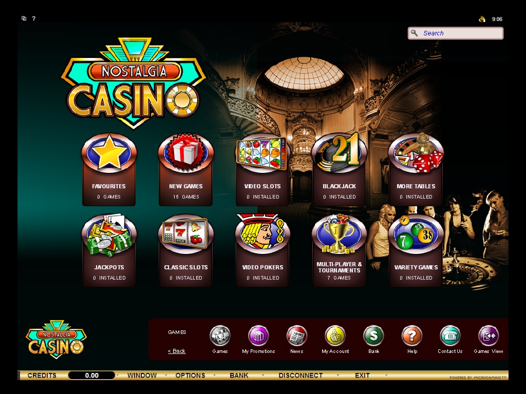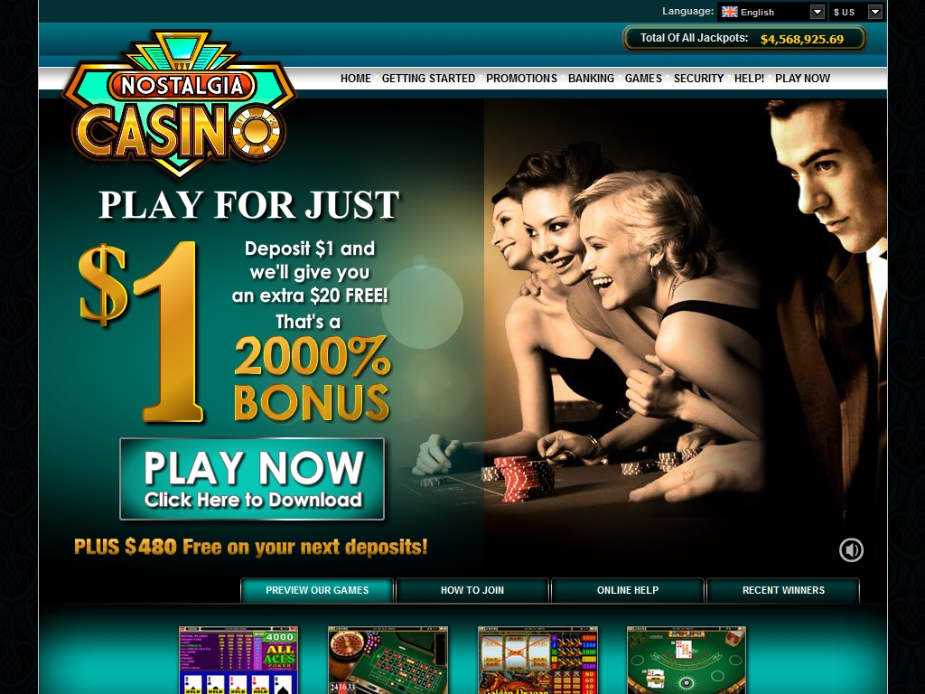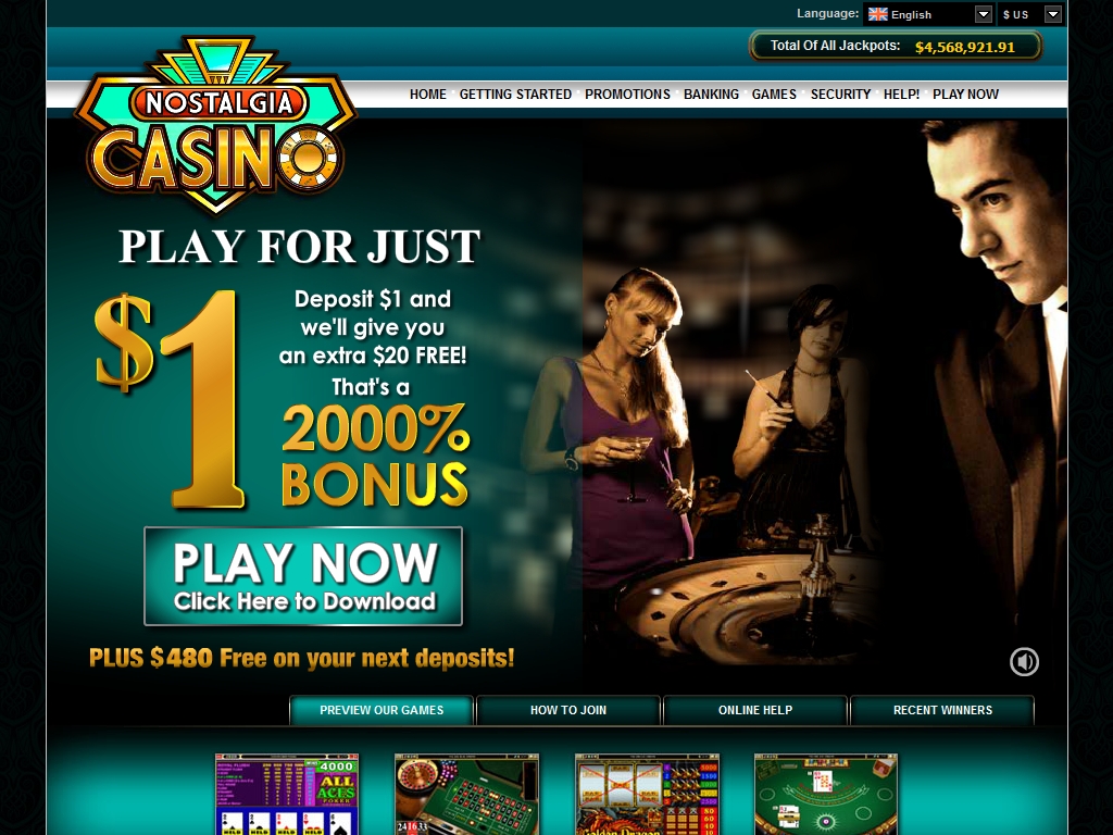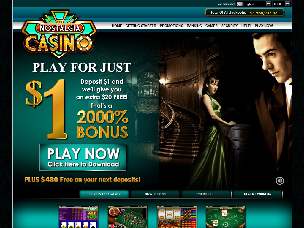 Мягкие тона, приглушенная музыка, приятная и не режущая глаз анимация и реклама, фотографии мужчин и женщины в вечерних нарядах – все это ожидает посетителя сайта Nostalgia. Впрочем, так выглядит лишь главная страница. Остальные разделы оформлены в характерном для казино из CasinoRewards Group стиле.