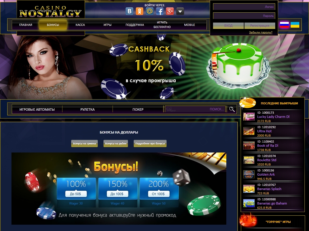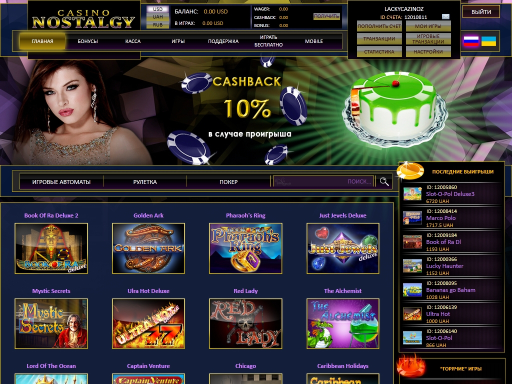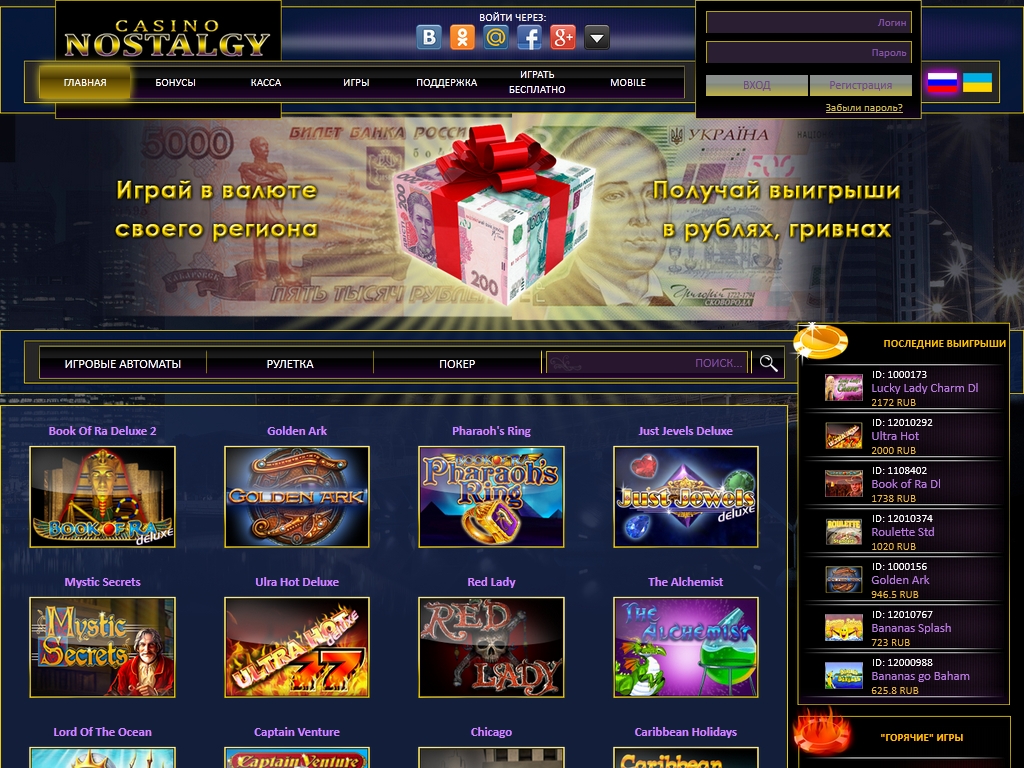Вносить депозиты и играть в Nostalgy можно в рублях, украинских гривнах и долларах. Для пополнения счета предусмотрены многочисленные способы, включая Visa, MasterCard, WebMoney, Yandex, QIWI, платежные терминалы, Приват24 и так далее.