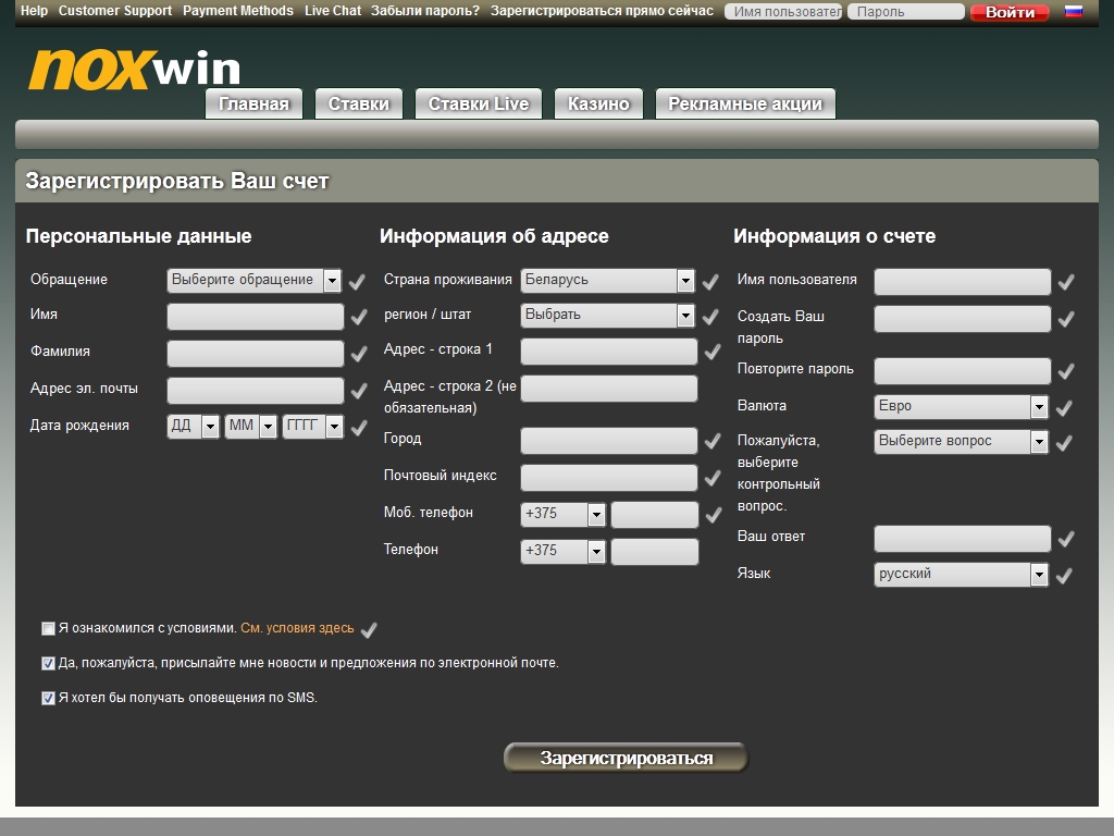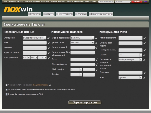 Как и все заведения на софте Net Entertainment или Microgaming, Noxwin отказывает в праве на регистрацию пользователям из ряда стран и территорий. Под обзором вы найдете список таких государств. Он может обновляться, поэтому лучше перед открытием счета уточнить у службы поддержки, можно ли вам заводить учетную запись.