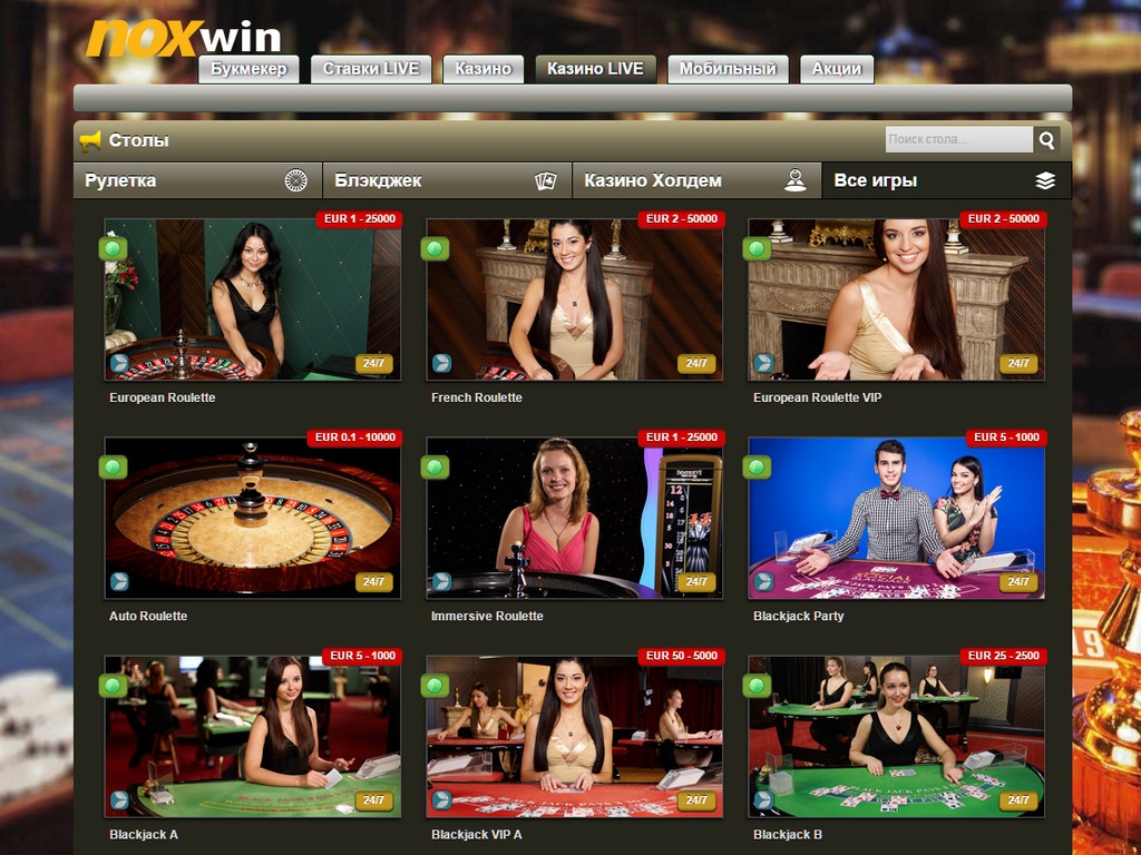 В Noxwin также доступны игры с настоящими крупье, работающими в специальной студии. В данном формате предлагаются несколько разновидностей блэкджека, рулетки и покера. Есть столы с разными диапазонами ставок, а дилеры говорят на разных языках. Подробнее live-casino портала будет рассматриваться в отдельном обзоре.