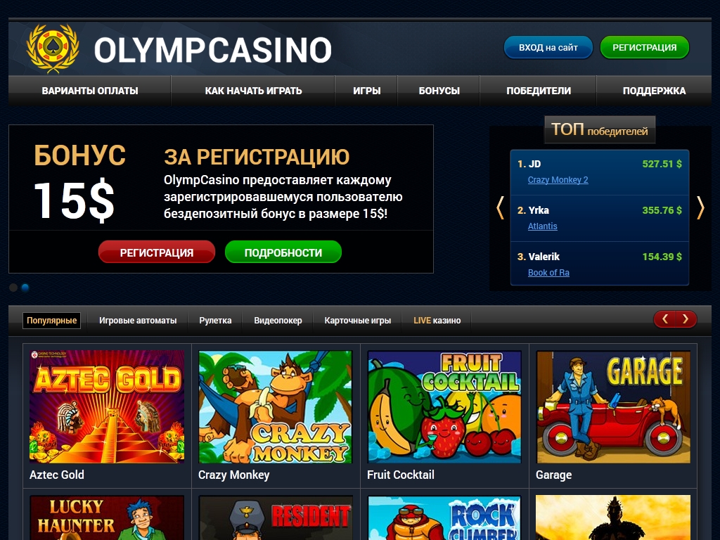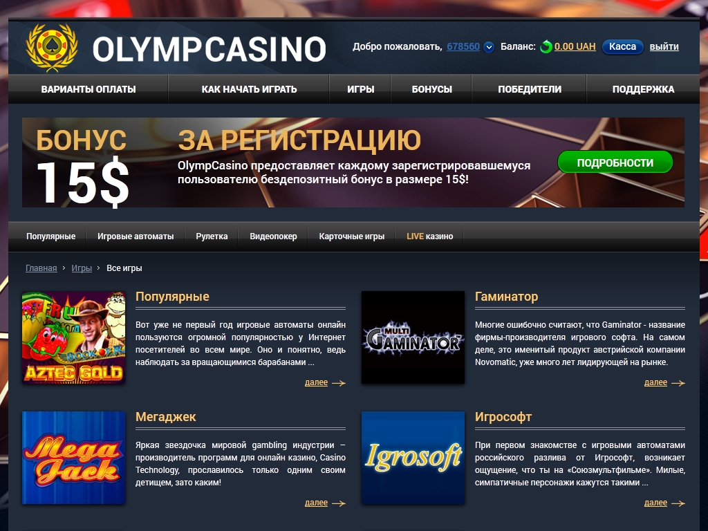В OlympCasino вы найдете более сотни игровых автоматов от разных производителей, рулетки, карточные игры, видео-покеры и модели других жанров. Все они запускаются во флэш-режиме. Их можно тестировать по условным ставкам, по только после регистрации. Когда мы писали обзор OlympCasino, турниры между клиентами не проводились, и накопительные джек-поты не разыгрывались.