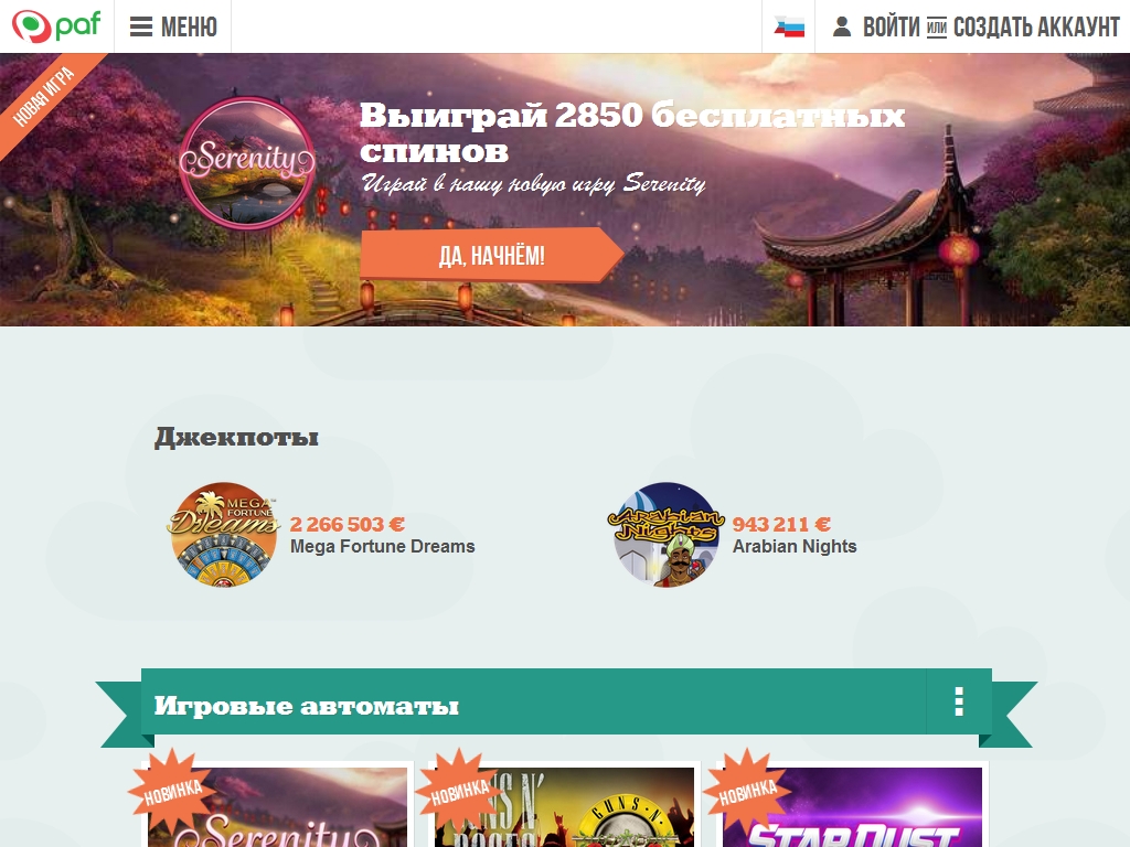 Прежде всего, радует, что портал Paf полностью переведен на грамотный русский язык. Здесь предлагаются неплохие игры (включая покер, интеллектуальные игры и многое другое), проводятся турниры. Также клиенты заведения могут тешить себя мыслью, что проигранные ними деньги идут на благотворительность.