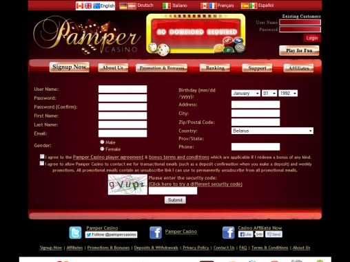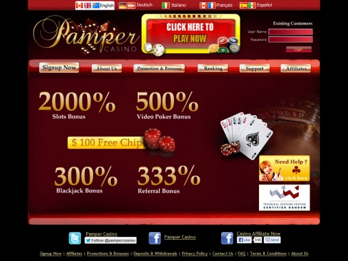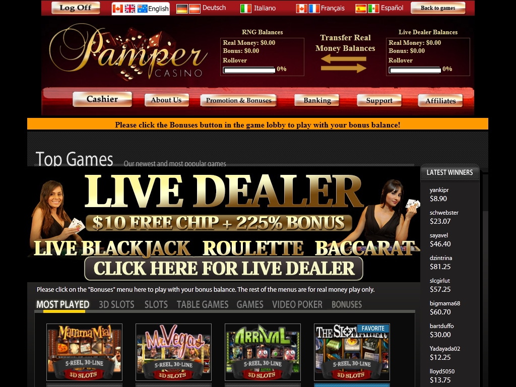 Pamper Casino предлагается на английском, немецком, французском, итальянском и испанском языках.