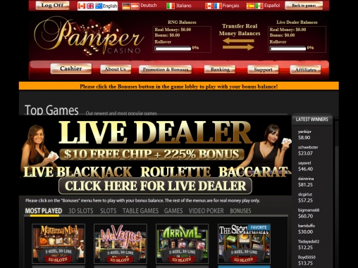 При загрузке главной страницы Pamper Casino появляется надпись «Приготовьтесь быть избалованными», после чего начинается презентация главных достоинств казино: трехмерных игр, бонусов и так далее. Выглядит все это весьма эффектно, как, впрочем, и сайт в целом.