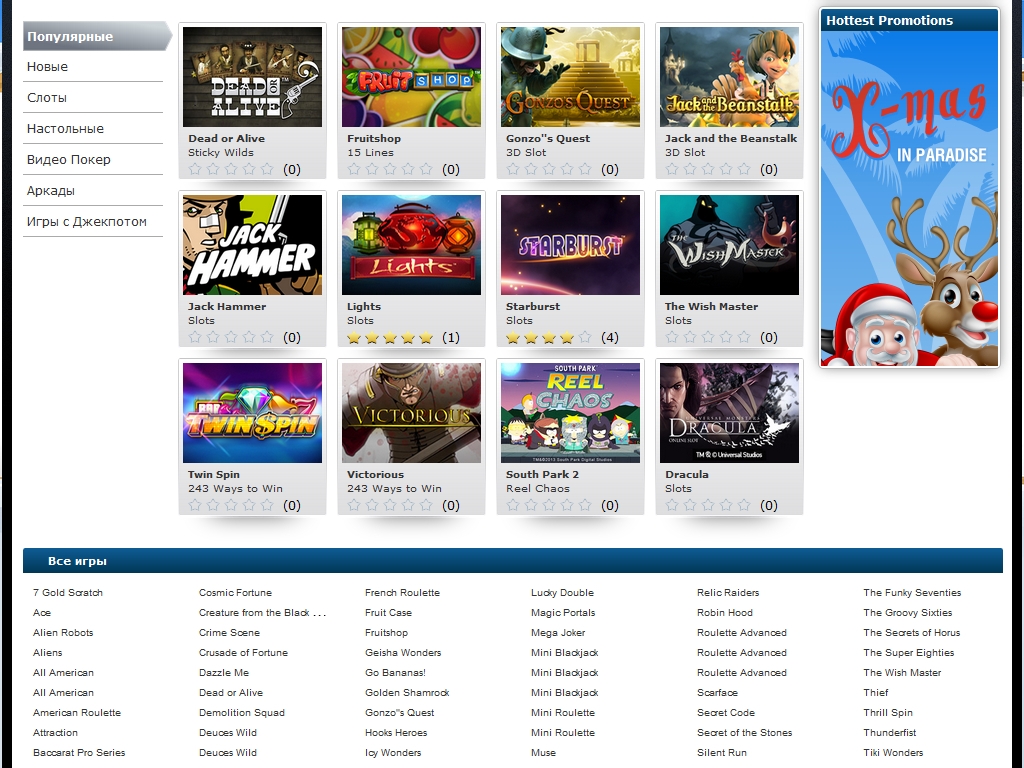 В каждой из этих групп есть подразделы, в которых игры отсортированы по жанровой принадлежности (слоты, настольные, аркады, видео-покеры), наличию прогрессивного джекпота, новизне и популярности у игроков.