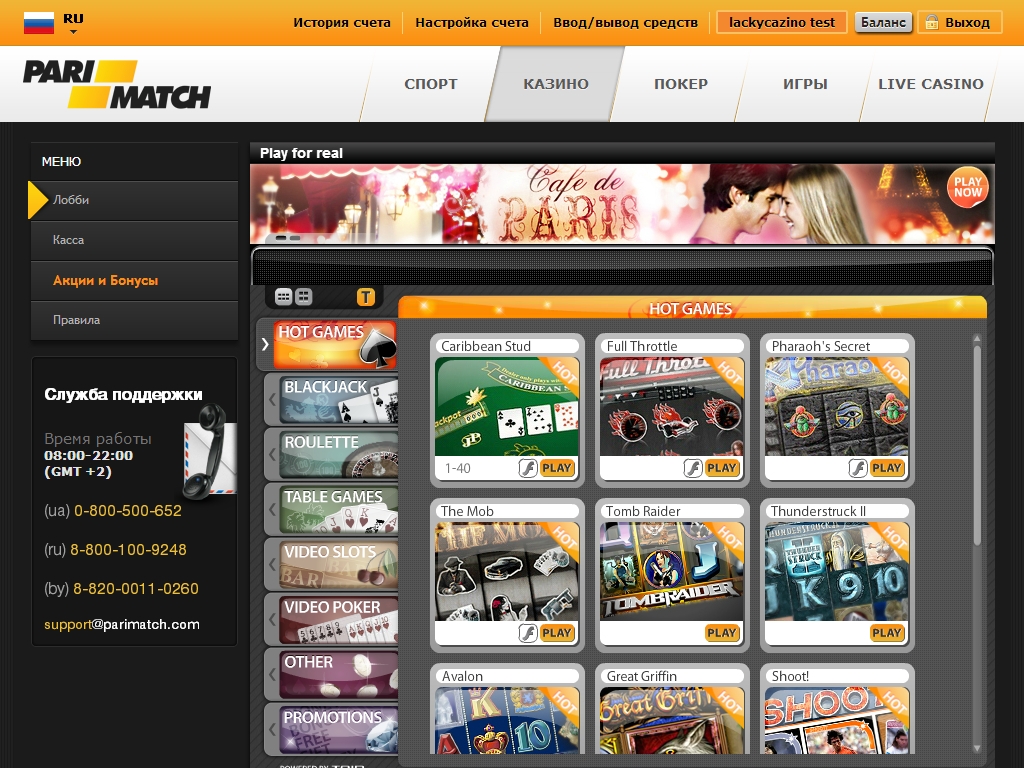 Клиенты PariMatch Casino могут наслаждаться приличным выбором качественных онлайн-игр производства компании Microgaming. К их услугам несколько десятков разнообразных видео-слотов, несколько блэкджеков, рулеток, покеров, баккара, видео-покеров, моментальных лотерей, развлекательных и прочих азартных игр. В некоторых из них разыгрываются прогрессивные джек-поты.