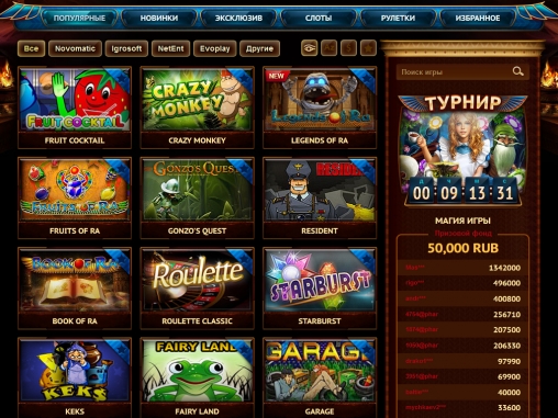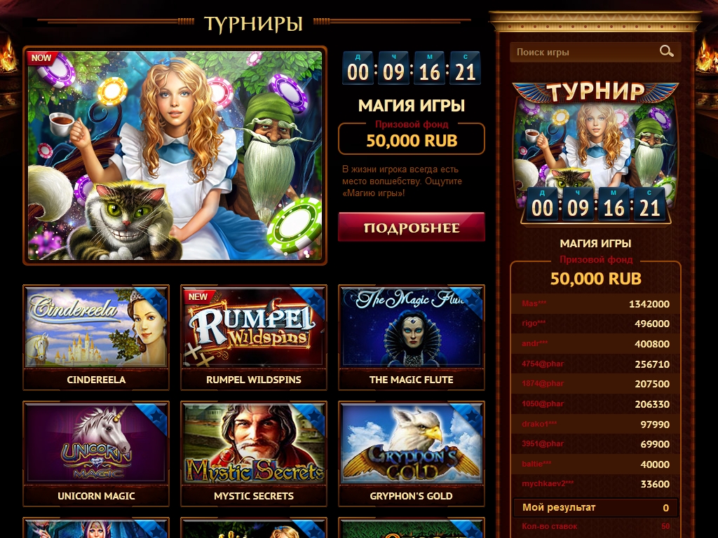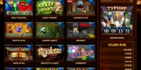 В казино есть раздел «Турниры», однако он пустует. Вероятно, подобные мероприятия запланированы на будущее.